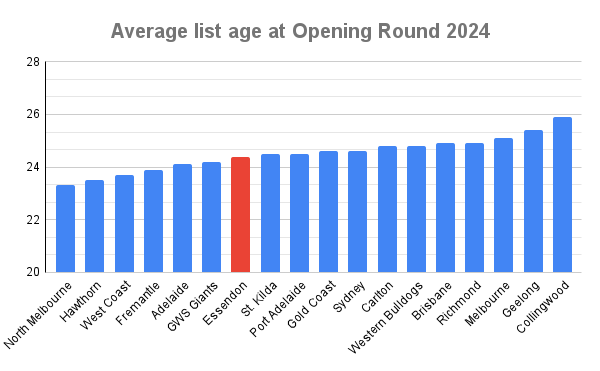Essendon have the seventh-youngest list in the AFL. But their best players are all aged between 25 and 28. I’m sure there are Bombers fans who might quibble with that definition (why no Nic Martin, for example), but it’s still pretty striking. Cast the net a little wider to include Sam Draper and Andrew McGrath, and that still holds true. You can see the logic: a nucleus of similarly-aged players, supplemented by wily veterans and promising youngsters, is basically shorthand for “premiership window”. But Essendon’s performances don’t suggest they’re in one. The problem with all your best players being in their mid-to-late 20s is that you can’t reasonably expect significant improvement at that age. Indeed, you’re more likely to see the early signs of decline. Essendon have some good young players with unique traits. But they’ll need to be really good to offset the expected loss in output from the likes of Merrett, Wright, Parish and Langford over the next 3-4 years.