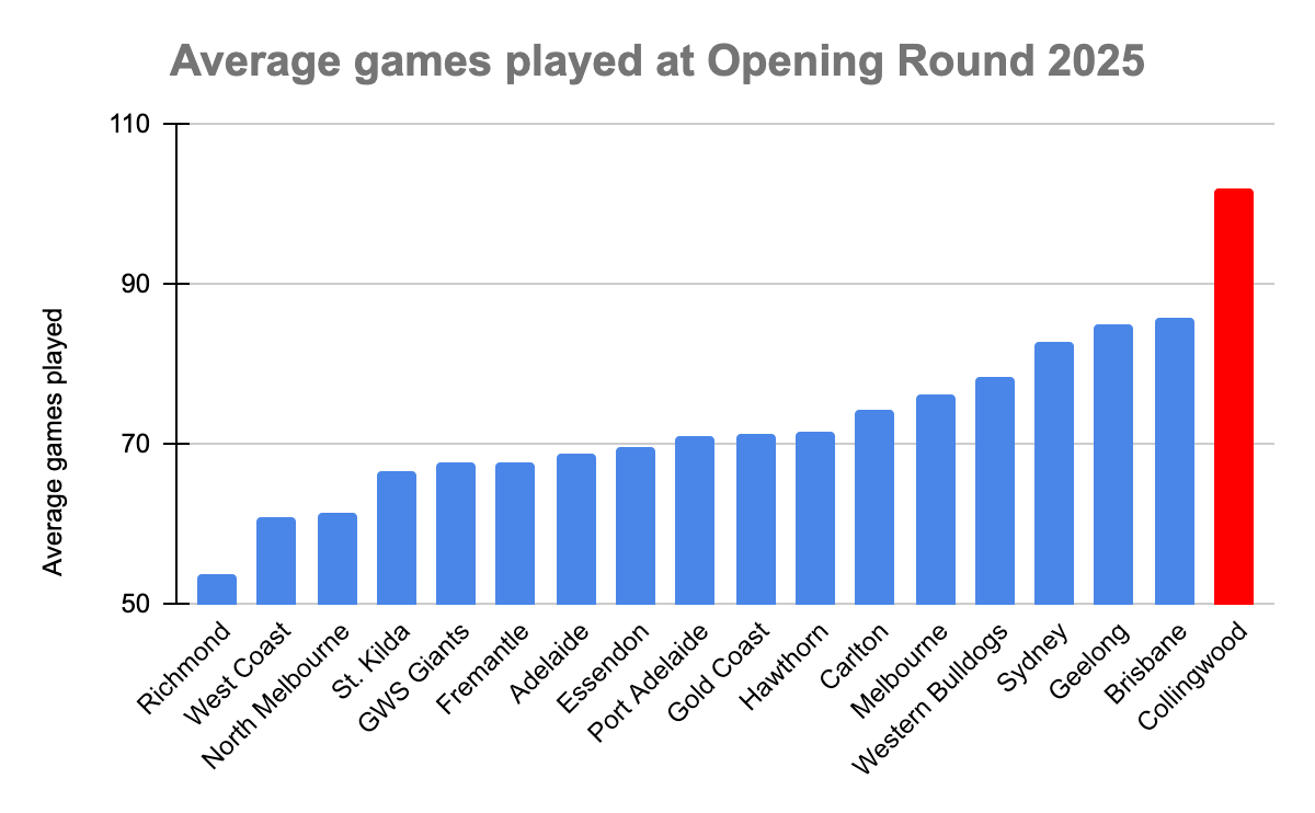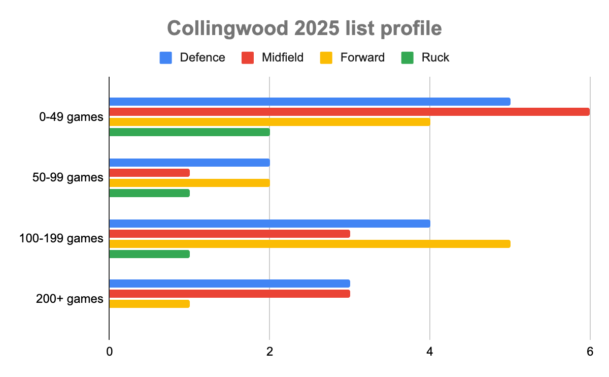 Let’s get the obvious out of the way. The Pies are old. In fact, I’m not sure there’s ever been an older or more experienced list in the AFL. Just take a look at the chart above – it’s fairly unprecedented. Although the fact of Collingwood’s age raises a question; what’s actually in scope for a season preview? Assembling such an old list, and assigning a low priority to the draft, will most likely be a problem for Craig McRae’s side in 2026, 2027 and 2028. But in 2025? I’m not so sure.
