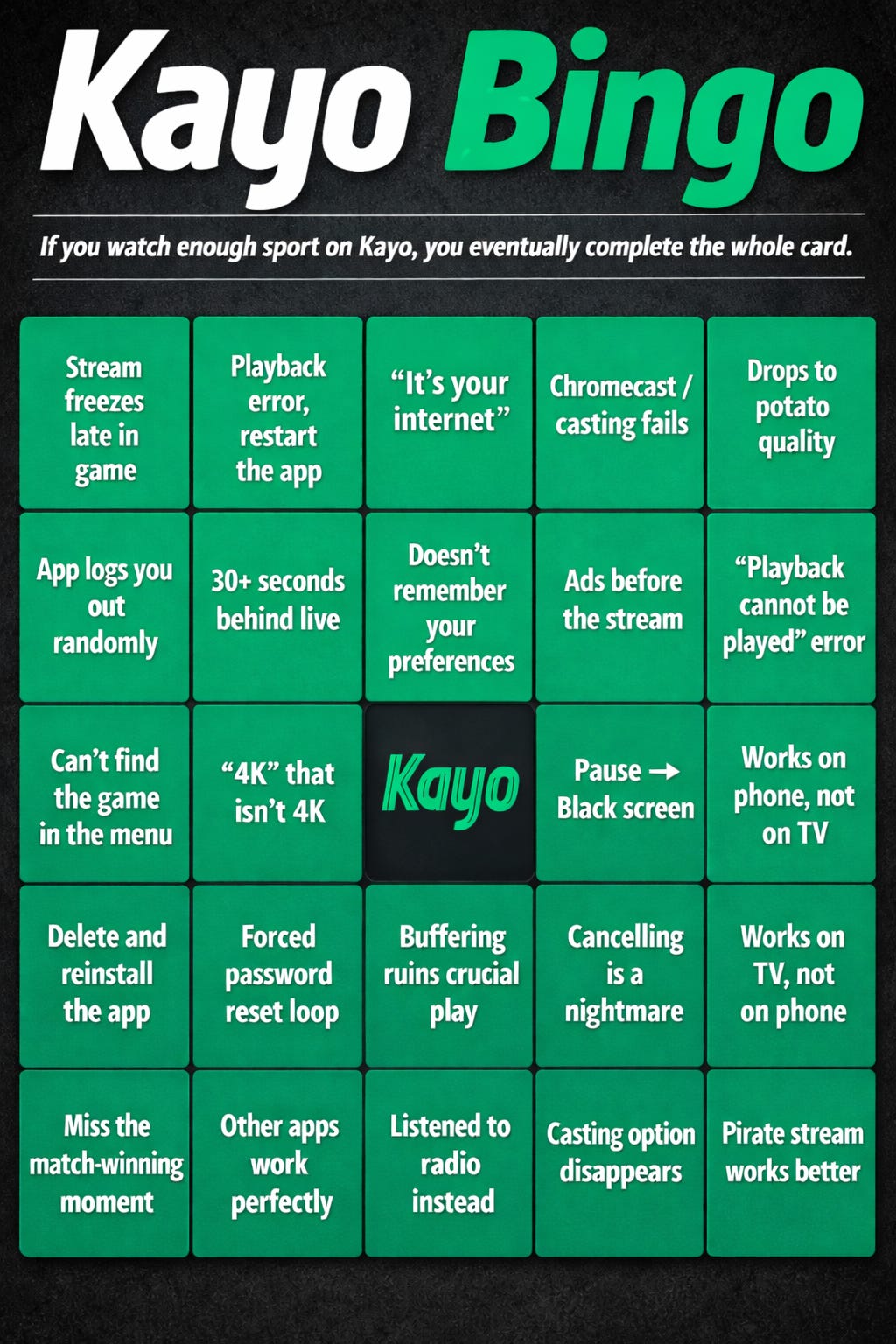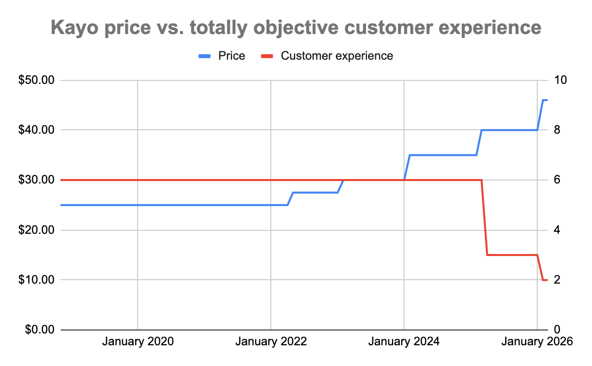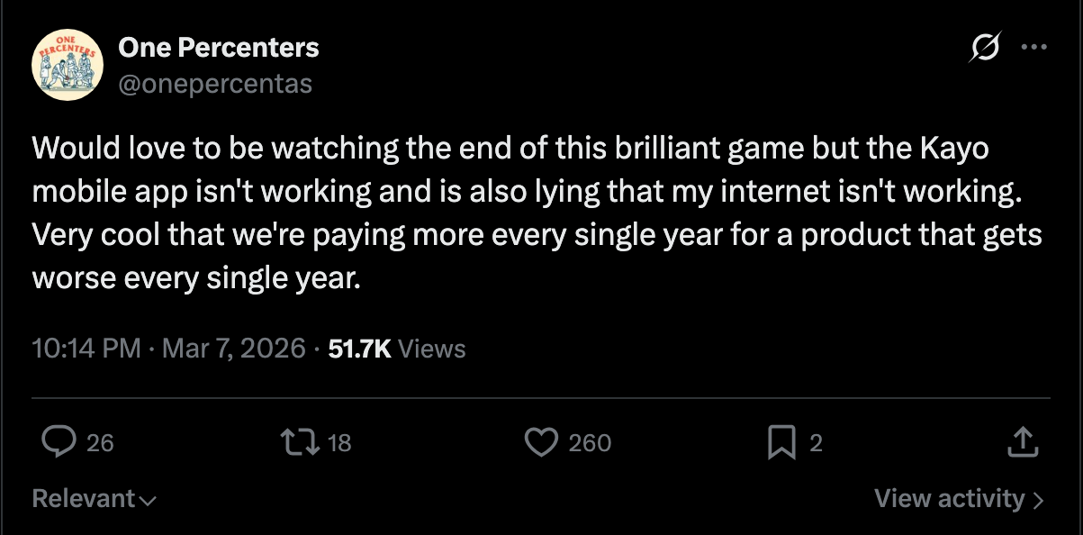 Beyond the sheer volume of complaints, what struck me most was their breadth. They didn’t cluster around just one part of the product. They spanned almost every layer of the experience: buffering streams, blurry video, casting errors, connections, login loops, confusing menus, inexplicable ads, and customer support that insists your internet connection is actually the problem. Not a single part of the stack is immune. It turns out that for a hell of a lot of people, even a “good” Kayo experience - i.e. one not marred by technical errors – skews mediocre. I’ve gotten this far without even mentioning the rapidly rising cost of subscription, which was cited in many complaints and was at least implicitly present in all. Kayo was $25 per month when it launched in 2018. As of February, the “premium” offering costs $46 per month.